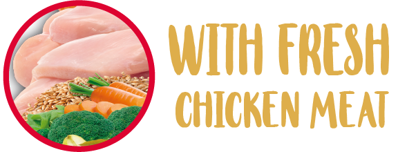 Viande de poulet déshydratée (42 %), viande de poulet fraîche (15 %), pois, tapioca, huile de poulet (7 %), foie de poulet hydrolysé (3 %), huile de saumon (2,2 %), protéines de pois, levure de bière, pulpe de pomme, caroube, minéraux, fruits (poire, pomme et myrtilles) (3 000 mg/kg), légumes (citrouille, carottes, épinards, brocoli et gingembre) (3 000 mg/kg), romarin, extrait de malt (500 mg/kg).