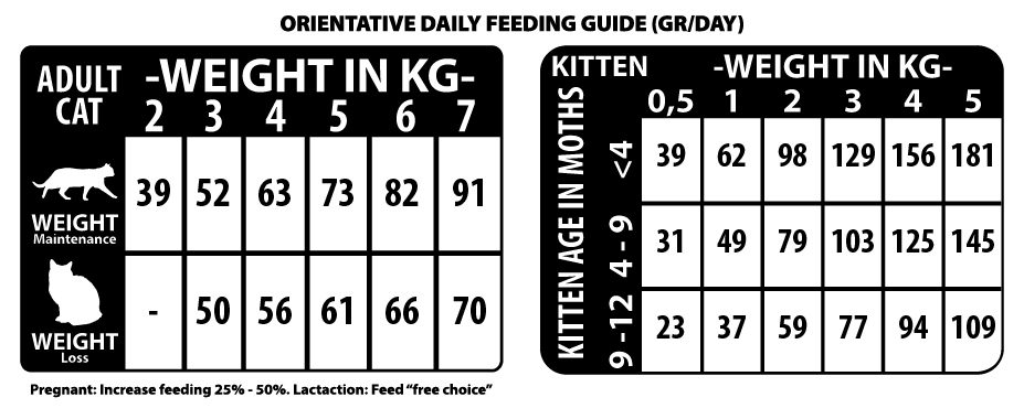 Vitamine A 18 000 UI/kg, Vitamine D3 1 750 UI/kg, Vitamine E 600 mg/kg, Vitamine C 100 mg/kg, Fer 75 mg/kg, Iode 3,5 mg/kg, Cuivre 10 mg/kg, Manganèse 7,5 mg/kg, Zinc 120 mg/kg, Sélénium 0,12 mg/kg, Taurine 1 000 mg/kg, DL-méthionine 750 mg/kg. Additifs technologiques : Antioxydants naturels (tocophérols).